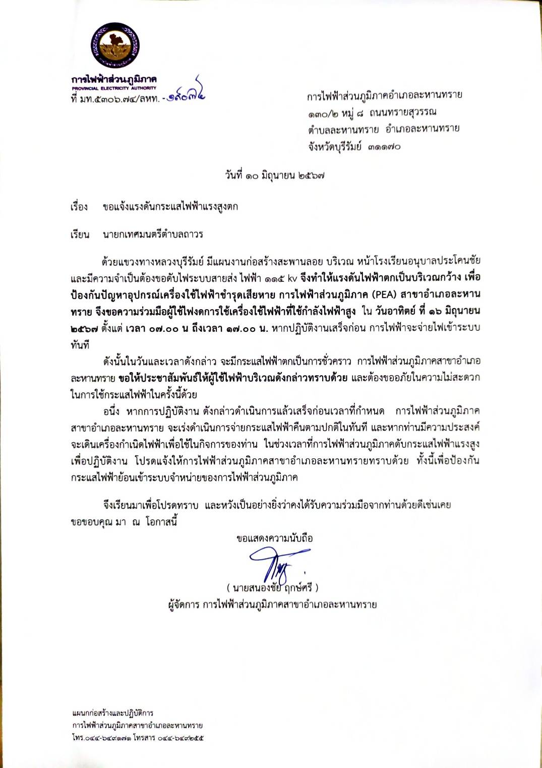 การไฟฟ้าส่วนภูิภาคอำเภอละหานทรายขอแจ้งแรงดันกระแสไฟฟ้าแรงสูงตก