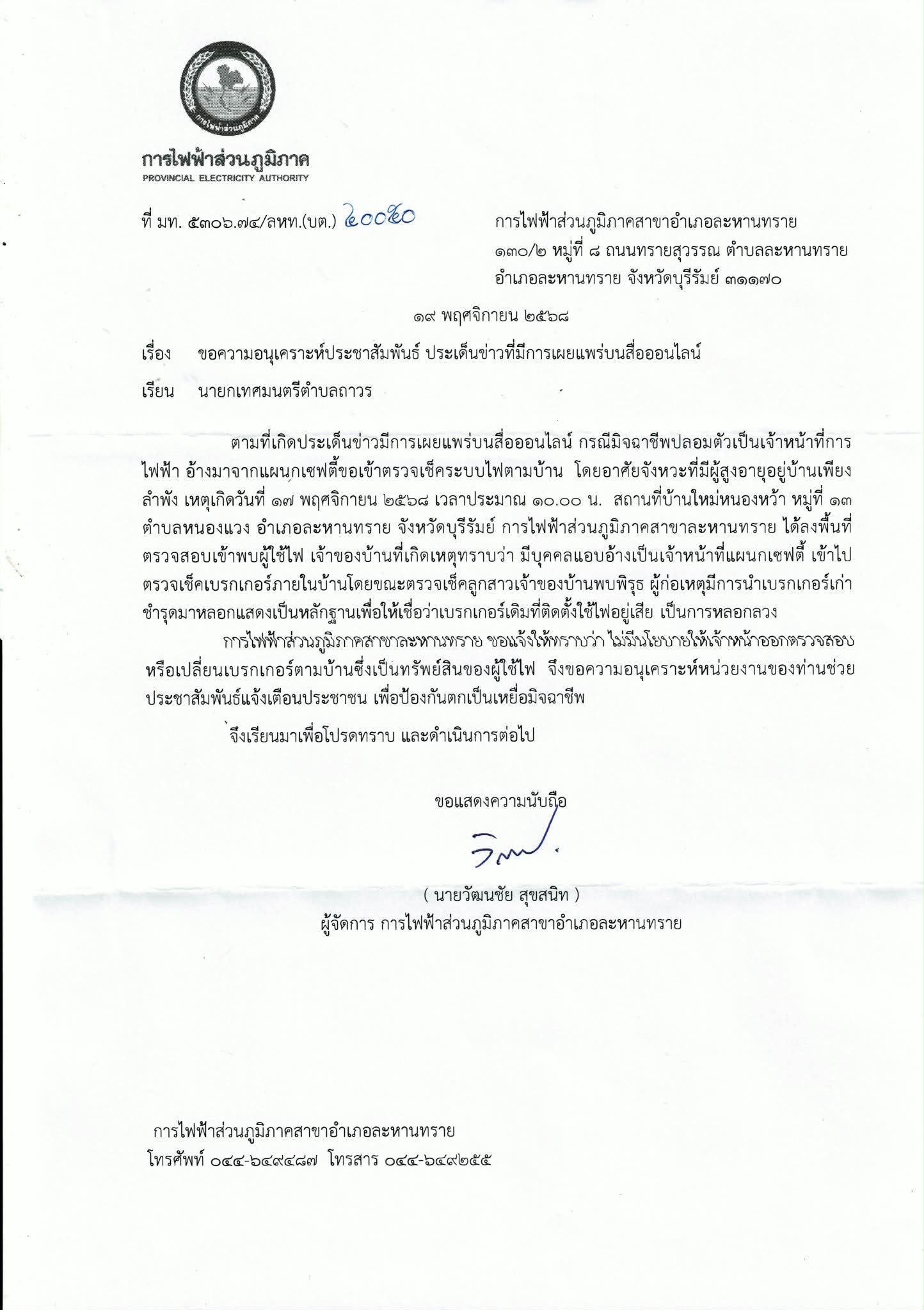 ข่าวฝากประชาสัมพันธ์ การไฟฟ้าส่วนภูมิภาคอำเภอละหานทราย