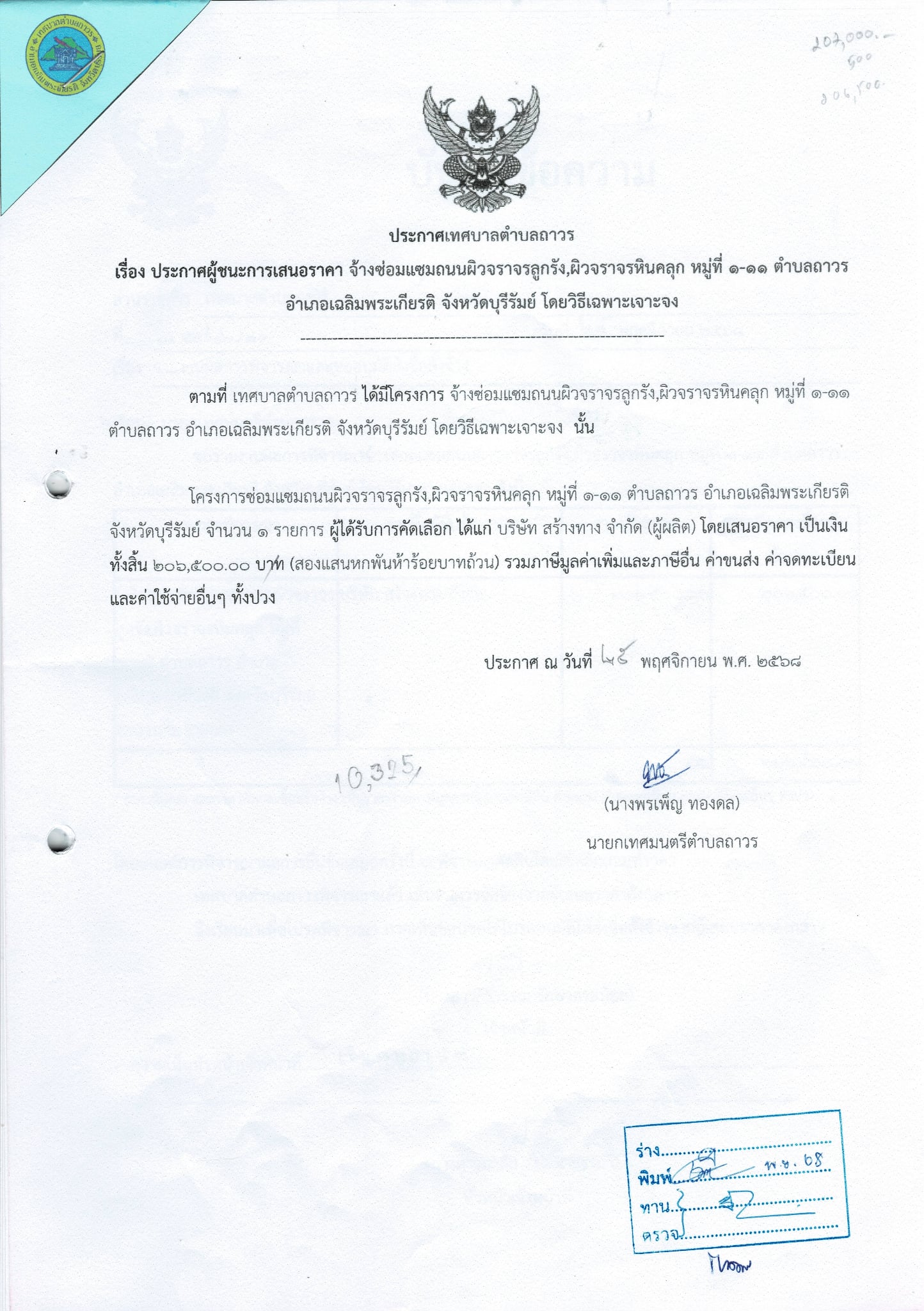 ประกาศผู้ชะนะการเสนอราคาการซ่อมถนนผิวจราจรลูกรัง,ผิวจราจรหินคลุก ม.1 - ม.11 ตำบลถาวร อำเภอเฉลิมพระเกียรติ จังหวัดบุรีรัมย์
