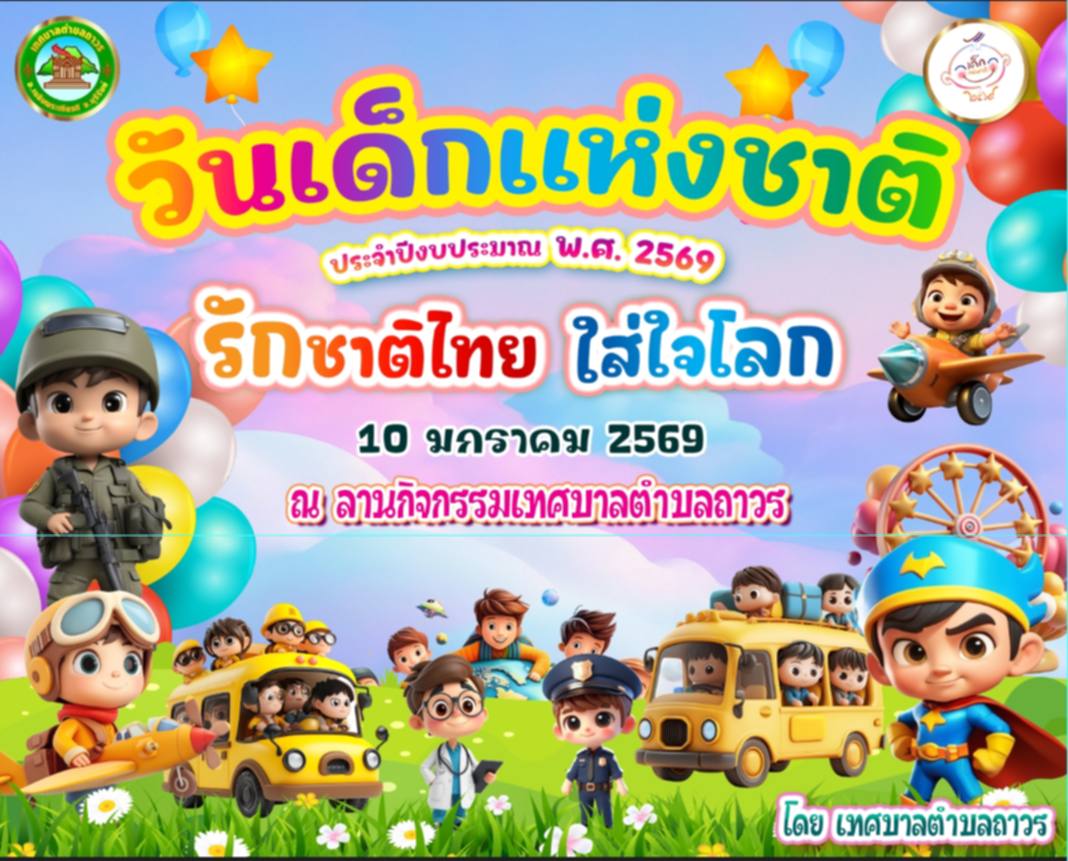 เชิญร่วมกิจกรรมงาน"วันเด้กแห่งชาตติ" ประจำปีงบประมาน 2569 ในวันเสาร์ที่ 10 มกราคม 2568 ณ ลานกิจกรรมเทศบาลตำบลถาวร อำเภอเฉลิมพระเกียรติ จังหวัดบุรีรัมย์ เวลา
